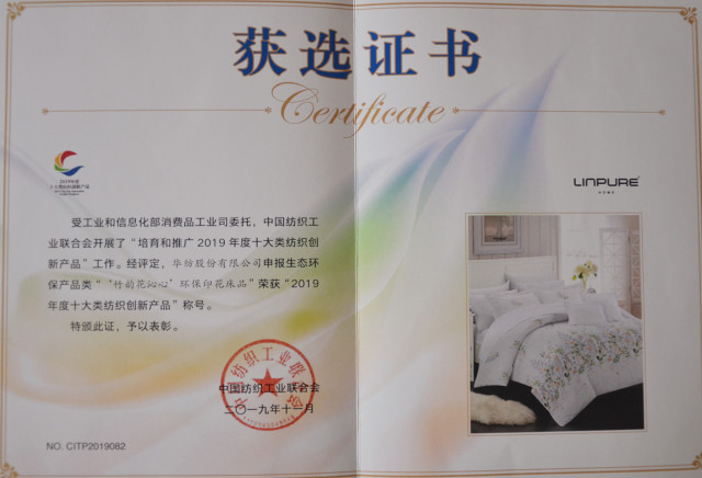 公司床品獲“2019年度十大類紡織創(chuàng)新床品”稱號(hào)