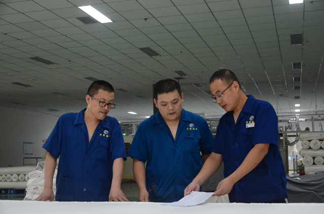 圖為裁剪工段主管凌建祿(右)在與開剪驗布工徐文成(中)、高洪波討論面料使用改進(jìn)。