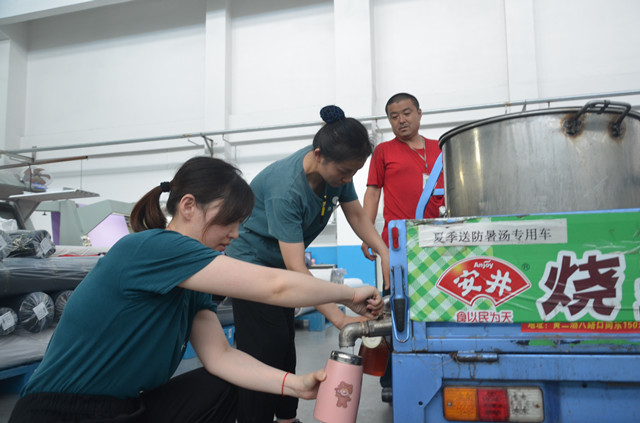 圖為6月20日公司向生產(chǎn)一線(xiàn)發(fā)送綠豆湯和西紅柿雞蛋湯的情形。