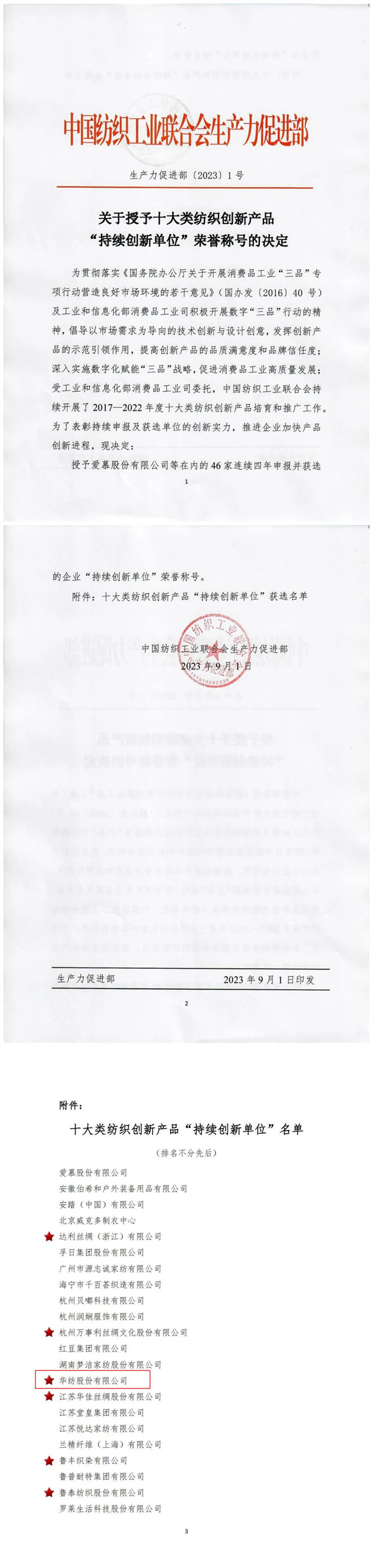 為表彰持續(xù)申報(bào)及獲選單位的創(chuàng)新實(shí)力,推進(jìn)企業(yè)加快產(chǎn)品創(chuàng)新進(jìn)程。近日,中國紡織工業(yè)聯(lián)合會(huì)生產(chǎn)力促進(jìn)部發(fā)布“關(guān)于十大類紡織創(chuàng)新產(chǎn)品‘持續(xù)創(chuàng)新單位’榮譽(yù)稱號的決定”,授予華紡股份有限公司等在內(nèi)的46家連續(xù)四年申報(bào)并獲選的企業(yè)“持續(xù)創(chuàng)新單位”榮譽(yù)稱號。