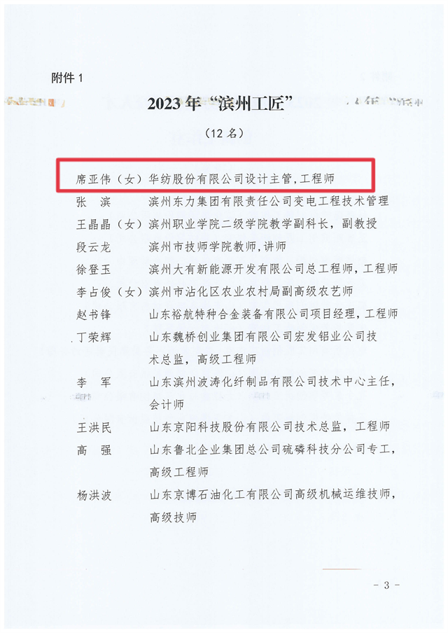 近日,濱州市總工會下發(fā)了《關(guān)于公布 2023 年濱州工匠濱州市勞模和工匠人才創(chuàng)新工作室的通知》,公司家紡研發(fā)部設(shè)計(jì)主管、工程師席亞偉榮獲2023年“濱州工匠”稱號、王魯剛工匠人才創(chuàng)新工作室榮獲“濱州市勞模和工匠人才創(chuàng)新工作室”榮譽(yù)。