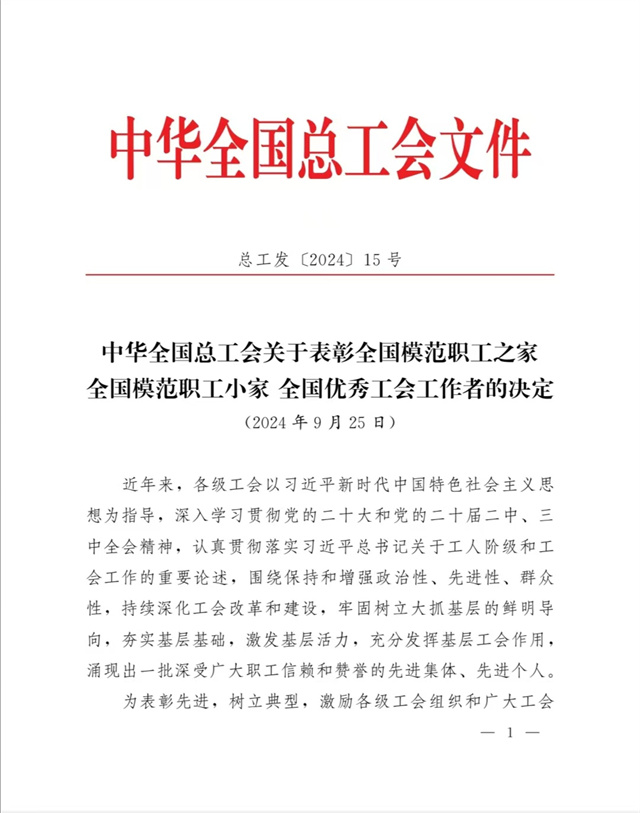 “全國(guó)模范職工之家”是中華全國(guó)總工會(huì)設(shè)立的授予全國(guó)工會(huì)系統(tǒng)先進(jìn)集體的最高榮譽(yù),是對(duì)基層工會(huì)工作的最高褒獎(jiǎng)和肯定。公司工會(huì)在公司黨委領(lǐng)導(dǎo)下,以習(xí)近平新時(shí)代中國(guó)特色社會(huì)主義思想為指導(dǎo),深入學(xué)習(xí)貫徹黨的二十大和黨的二十屆二中、三中全會(huì)精神,認(rèn)真貫徹落實(shí)習(xí)近平總書(shū)記關(guān)于工人階級(jí)和工會(huì)工作的重要論述,牢固把握正確政治方向,充分發(fā)揮橋梁紐帶作用,切實(shí)維護(hù)職工合法權(quán)益,努力構(gòu)建和諧勞動(dòng)關(guān)系,不斷增強(qiáng)工會(huì)組織的引領(lǐng)力、組織力、服務(wù)力,為公司高質(zhì)量發(fā)展貢獻(xiàn)工會(huì)智慧和力量。