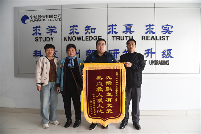 4月8日,服裝車間員工房虎收到了一面飽含深情的錦旗,上面寫(xiě)著“無(wú)償獻(xiàn)血有大愛(ài),熱血救人暖人心”。這面錦旗不僅是對(duì)房虎長(zhǎng)期堅(jiān)持無(wú)償獻(xiàn)血善舉的高度認(rèn)可,更彰顯了華紡人熱心公益、奉獻(xiàn)社會(huì)的精神風(fēng)貌。