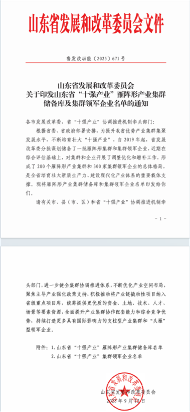 近日,省發(fā)展改革委組織開展了2025年度省“十強產(chǎn)業(yè)”雁陣形產(chǎn)業(yè)集群及集群領(lǐng)軍企業(yè)評選工作,經(jīng)行業(yè)評價、專家評審、綜合論證等程序,研究確定了擬增補雁陣形產(chǎn)業(yè)集群28個,集群領(lǐng)軍企業(yè)27家。公司憑借在行業(yè)中的顯著優(yōu)勢和綜合實力,成功入選山東省“十強產(chǎn)業(yè)”集群領(lǐng)軍企業(yè)。