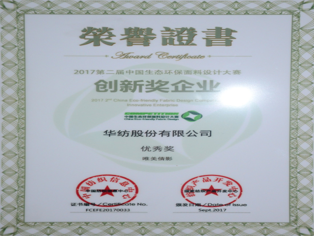 日前,由中國紡織工業(yè)聯(lián)合會主辦的中國國際面料設(shè)計大賽、中國生態(tài)環(huán)保面料設(shè)計大賽活動圓滿結(jié)束,公司在大賽中取得可喜成績,分別榮獲“2018/2019秋冬中國流行面料入圍企業(yè)”、“2017第二屆中國生態(tài)環(huán)保面料創(chuàng)新企業(yè)”榮譽稱號。