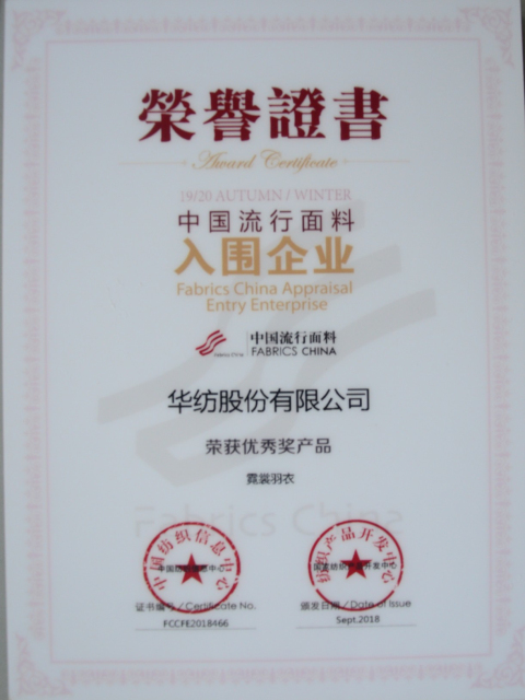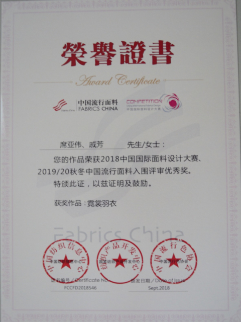 導(dǎo)讀:日前,公司在2018年中國國際面料設(shè)計大賽、第40屆(2019/20秋冬)中國流行面料入圍評審中再獲佳績,被授予“2019/20秋冬流行面料入圍企業(yè)”稱號,由席亞偉、戚芳設(shè)計的“霓裳羽衣”面