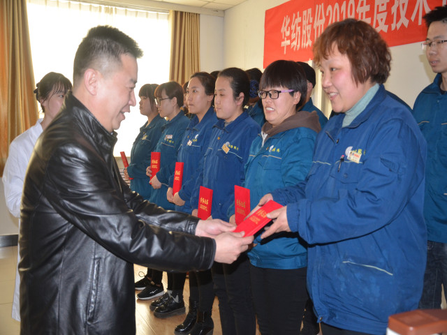 總工程師羅維新宣讀了《關于對2018年度綜合評比獲獎團隊及個人的表彰決定》和《關于對染整專業(yè)技術培訓班(第七期)劉江等15人準予結業(yè)的通報》;黨委書記、董事長王力民為獲得表彰的優(yōu)秀團隊面三車間技術團隊頒發(fā)獎狀;總經理閆英山為27名優(yōu)秀技術人員和15名輪訓班結業(yè)人員頒發(fā)相應證書。優(yōu)秀技術人員代表韓延衛(wèi)和優(yōu)秀打樣員代表張齊先后發(fā)言。