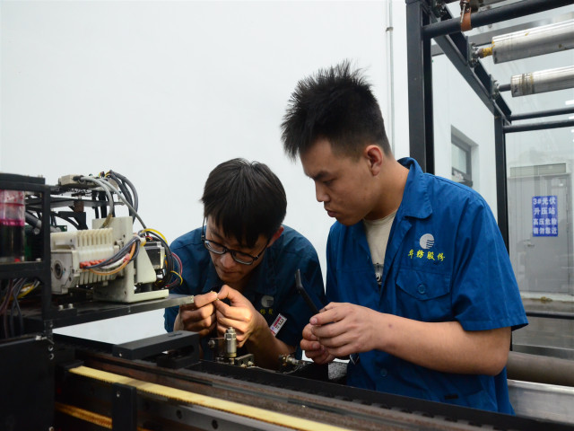 圖為家紡車間呂鵬廷(左)與尹廣濤在修復(fù)光柵讀頭。